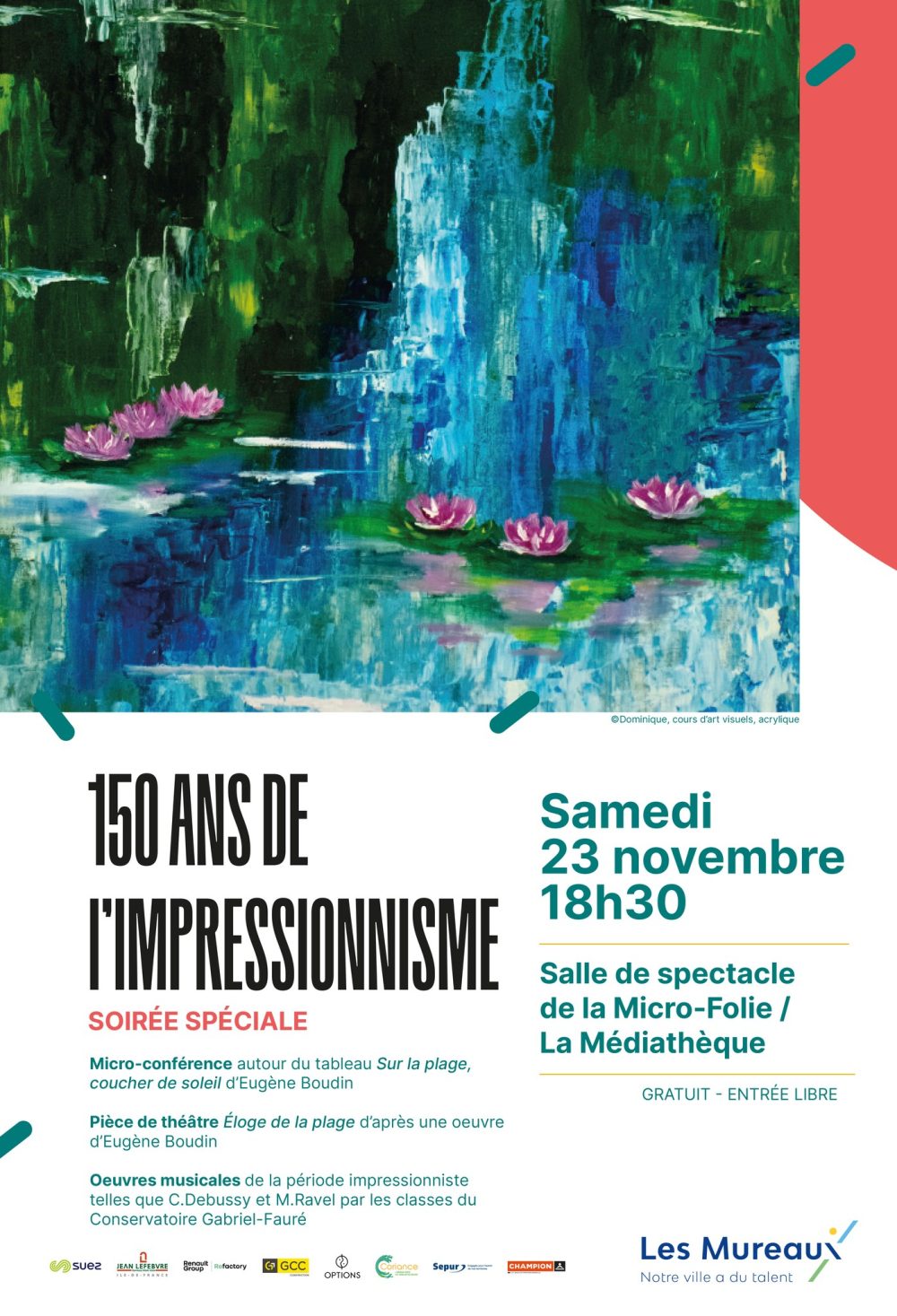La Micro-Folie en partenariat avec le Conservatoire Gabriel-Fauré vous propose une soirée spéciale autour du mouvement artistique de l’impressionnisme : micro-conférence autour du tableau Sur la plage, coucher de soleil d’Eugène Boudin, pièce de théâtre Éloge de la plage d’après une Å“uvre d’Eugène Boudin et Å“uvres musicales de la période impressionniste telles que celles de Claude Debussy ou encore de Maurice Ravel.