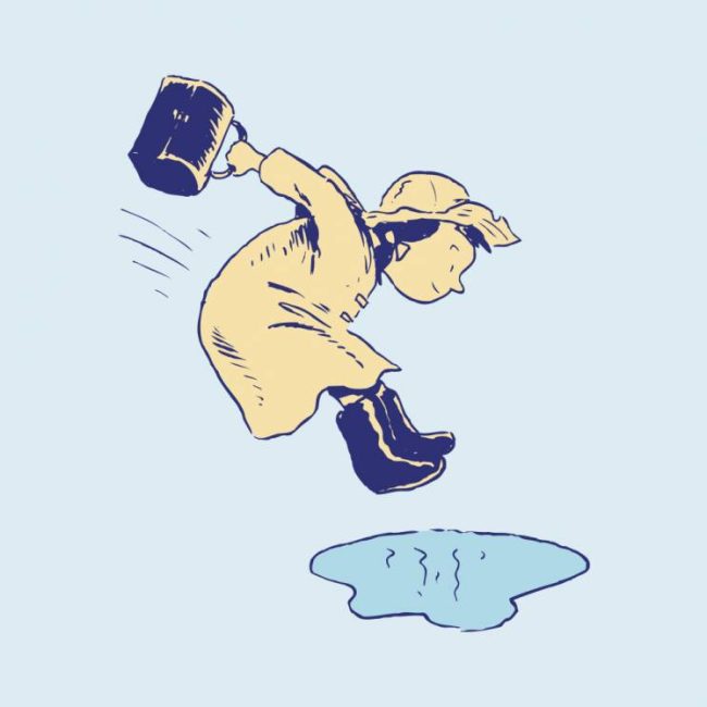C’est l’heure de la récréation. Elle est prête, le caillou bien calé dans la poche, à arriver la première à la marelle. La cour de l’école s’ouvre grand devant elle et ses deux amies, elle s’élance, se fiche de la pluie parce qu’elle a ses bottes et son imperméable et…