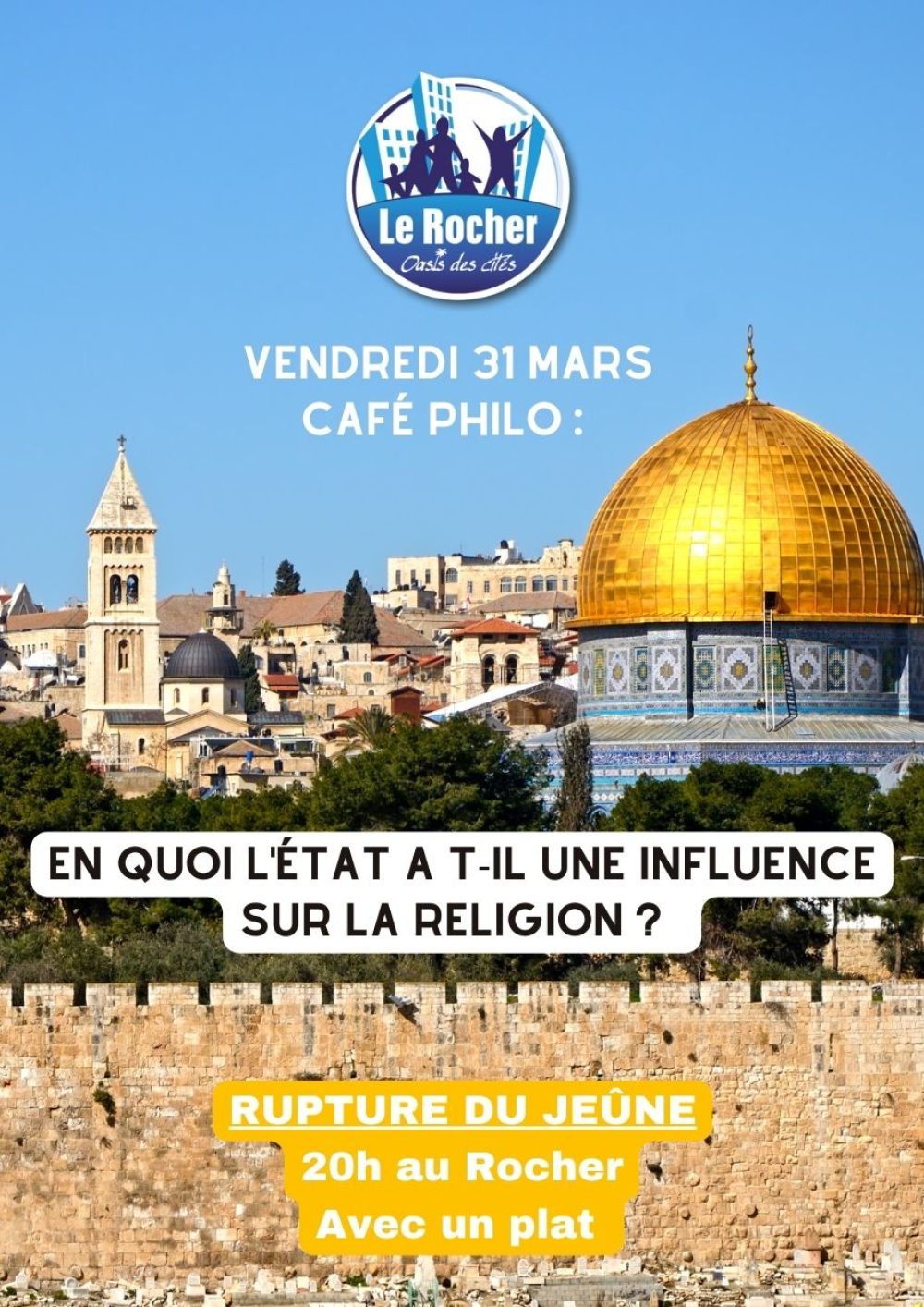 Avec le Rocher, leur prochain café philo aura lieu le vendredi 31 mars prochain à 20h au Rocher avec un thème inspiré par les grands jeunes du quartier lié à la concomitance du ramadan musulman et du carême catholique :