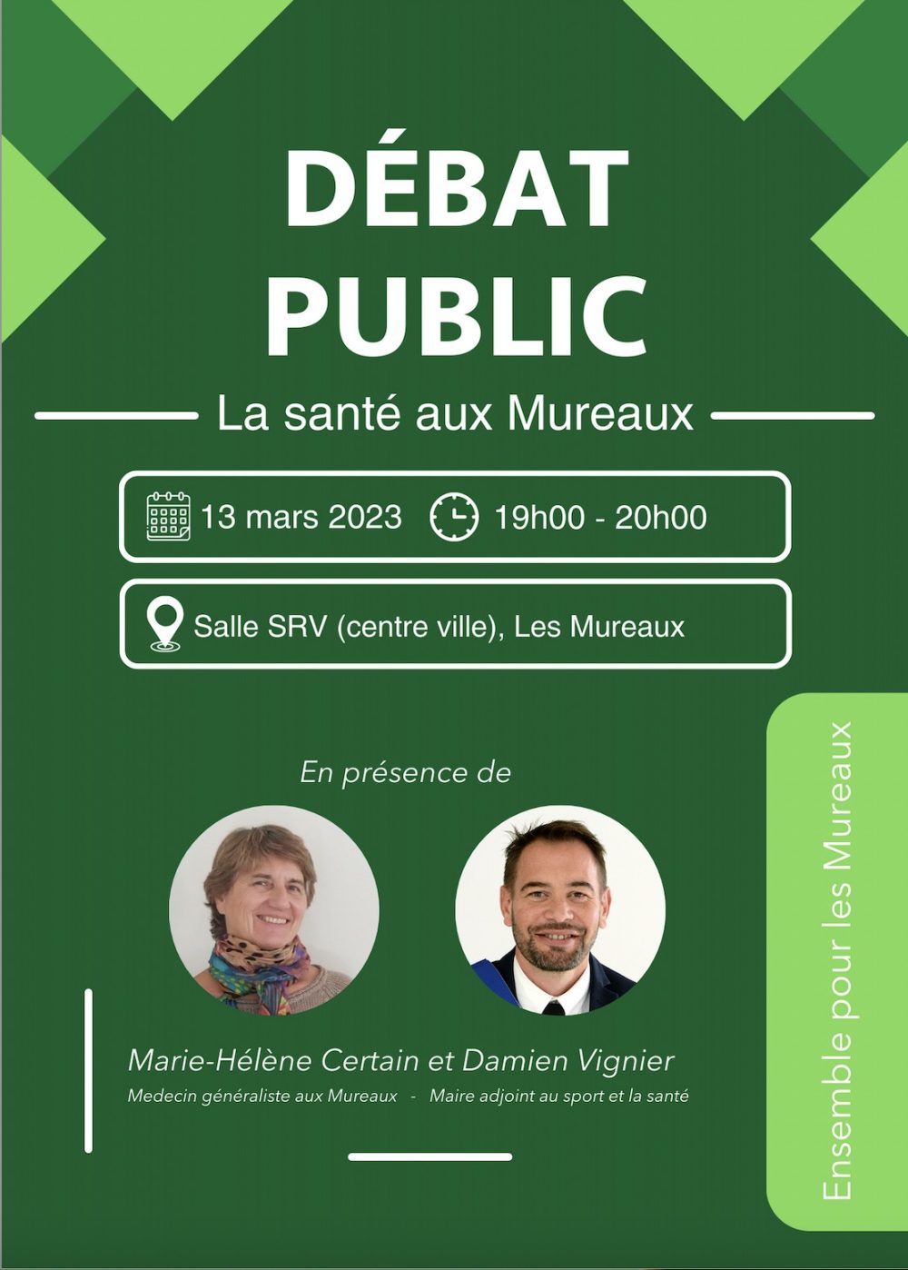 Avec un débat public sur la thématique de la santé est organisé aux Mureaux à la Salle SRV en présence de M. Damien Vignier, Adjoint au maire aux sports et à la Santé des Mureaux et Mme Marie-Hélène Certain, médecin généraliste.