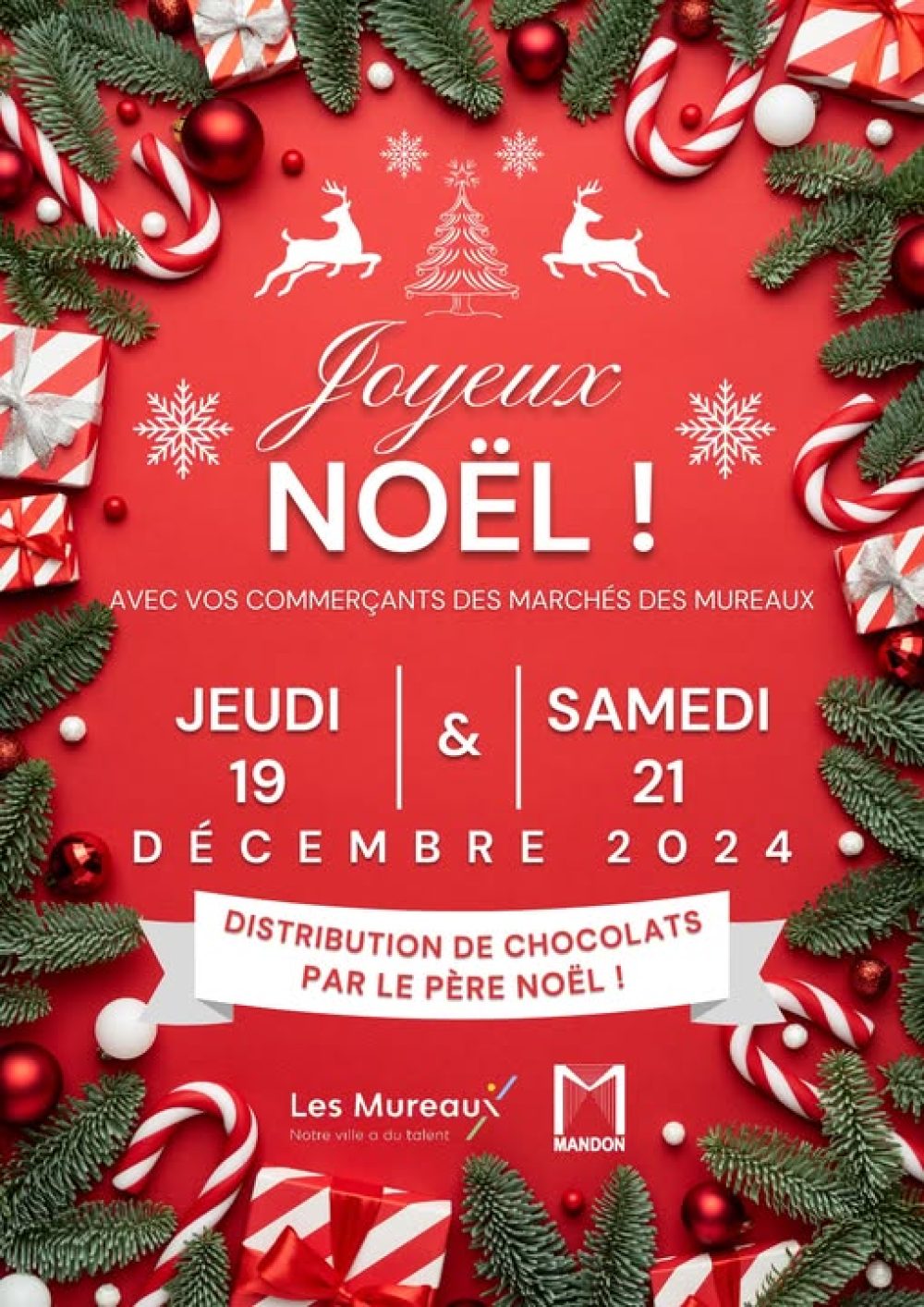 Opération spéciale Noël avec les commerçants des marchés des Mureaux ! Le jeudi 19 décembre et le samedi 21 décembre, le Père Noël sera présent lors du marché pour une distribution de chocolats ![]()