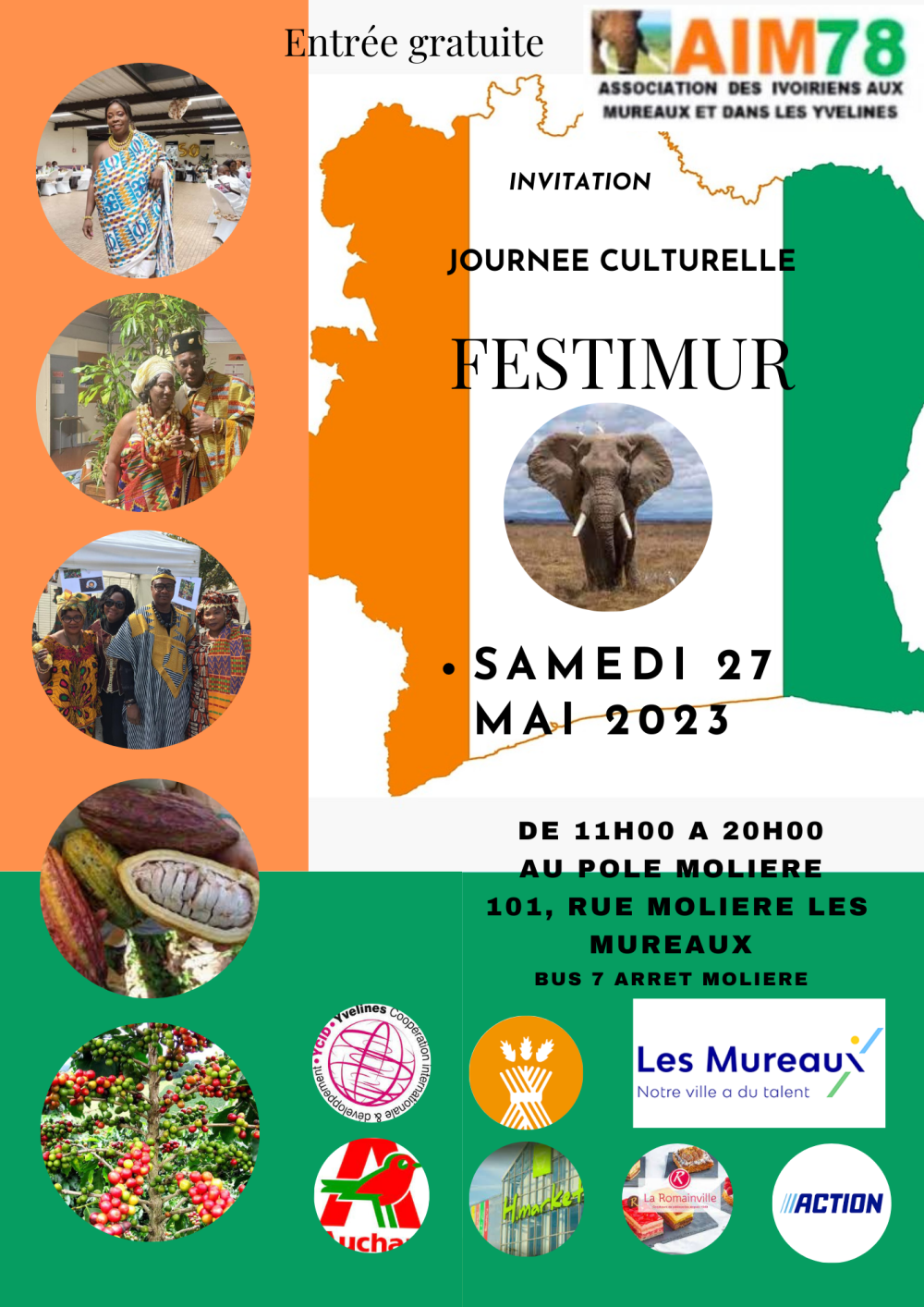 C’est avec un immense plaisir que l’Association des Ivoiriens aux Mureaux et dans les Yvelines AIM78 vous annonce la tenue de sa journée culturelle dénommée: FESTIMUR qui aura lieu au Pole Molière 101, Rue Molière Les Mureaux le samedi 27 Mai 2023 de 11h00 à 20h00.