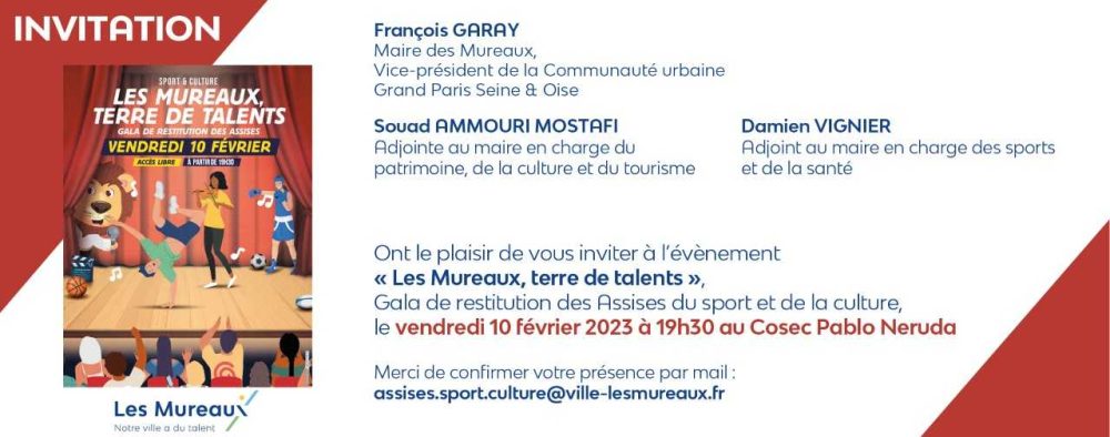 A cet effet, le Gala de restitution des Assises du Sport et de la Culture se tiendra le vendredi 10 Février 2023 à 19h30 au COSEC Pablo Neruda aux Mureaux.