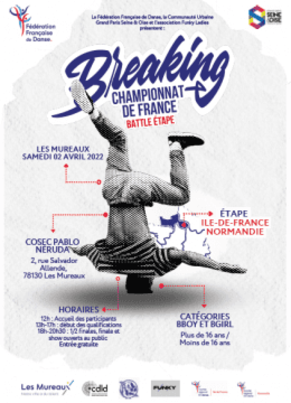 La Fédération Française de Danse/ (FFD) et La Communauté urbaine Grand Paris Seine & Oise (GPSO) organisent le Battle étape inter-régional Ile-de-France/Normandie du championnat de France de Breaking FFD en partenariat avec la Ville des Mureaux, Le CDLD – Centre de la Danse P.Doussaint GPSO, l’association Funky Ladies (Les Mureaux, 78) et l’association VNR (Aulnay-sous-Bois, 93).