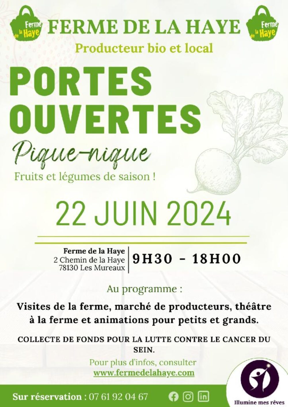 De plus, un stand sera dédié à l’association « Illumine mes rêves » qui œuvre pour la lutte contre le cancer. Vous pourrez faire un don qui sera intégralement reversé à cette noble cause. Les actions de l’association ainsi que sa collaboration avec la Ferme de la Haye pour « la Marche Rose » vous seront présentées.
