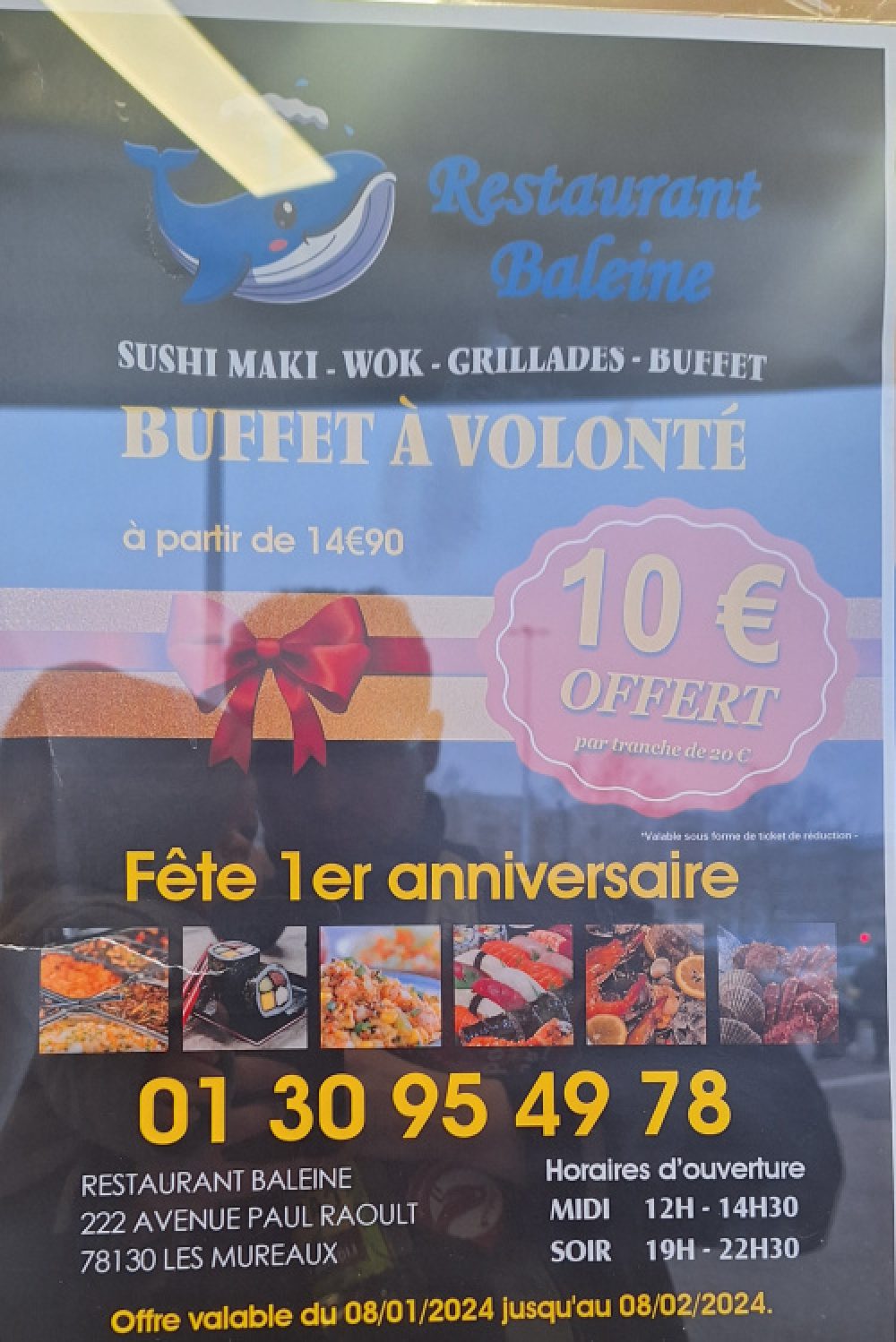 Du 8 janvier au 8 février 2024, le restaurant La Baleine, situé sur le Centre Commercial Espace aux Mureaux, fête sa première année d’existence avec offre pour ses clients.