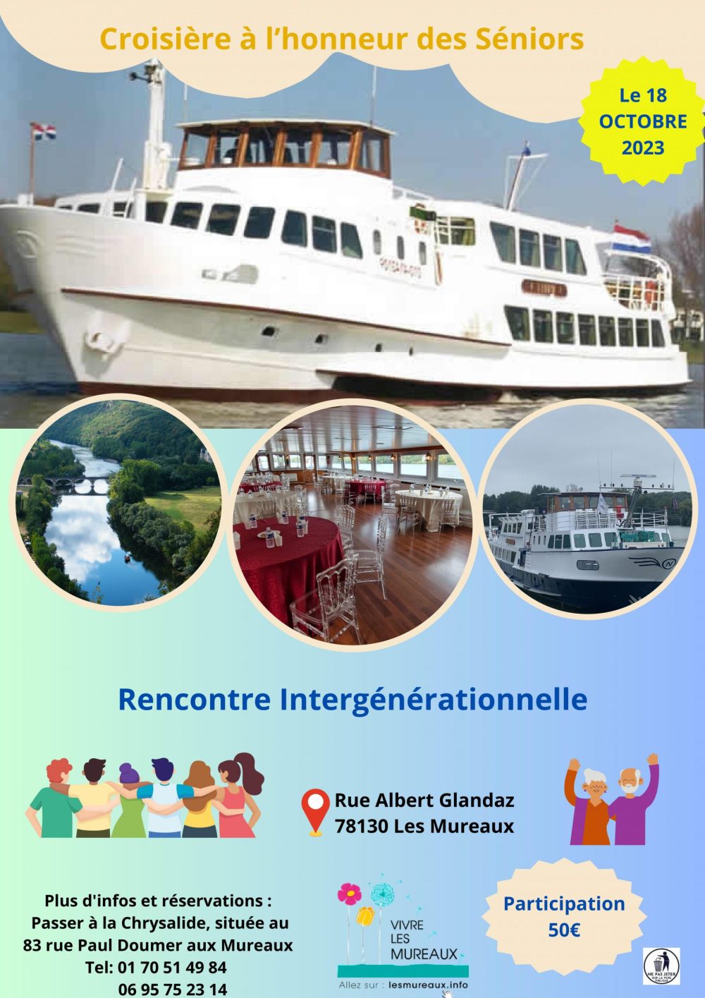 La croisière à l’honneur des seniors, organisée le 18 octobre 2023 de 11h à 15h par le PTCE Vivre Les Mureaux est une rencontre intergénérationnelle. À bord du bateau, cadets et seniors échangeront sur des sujets de leurs générations, dans un cadre convivial.