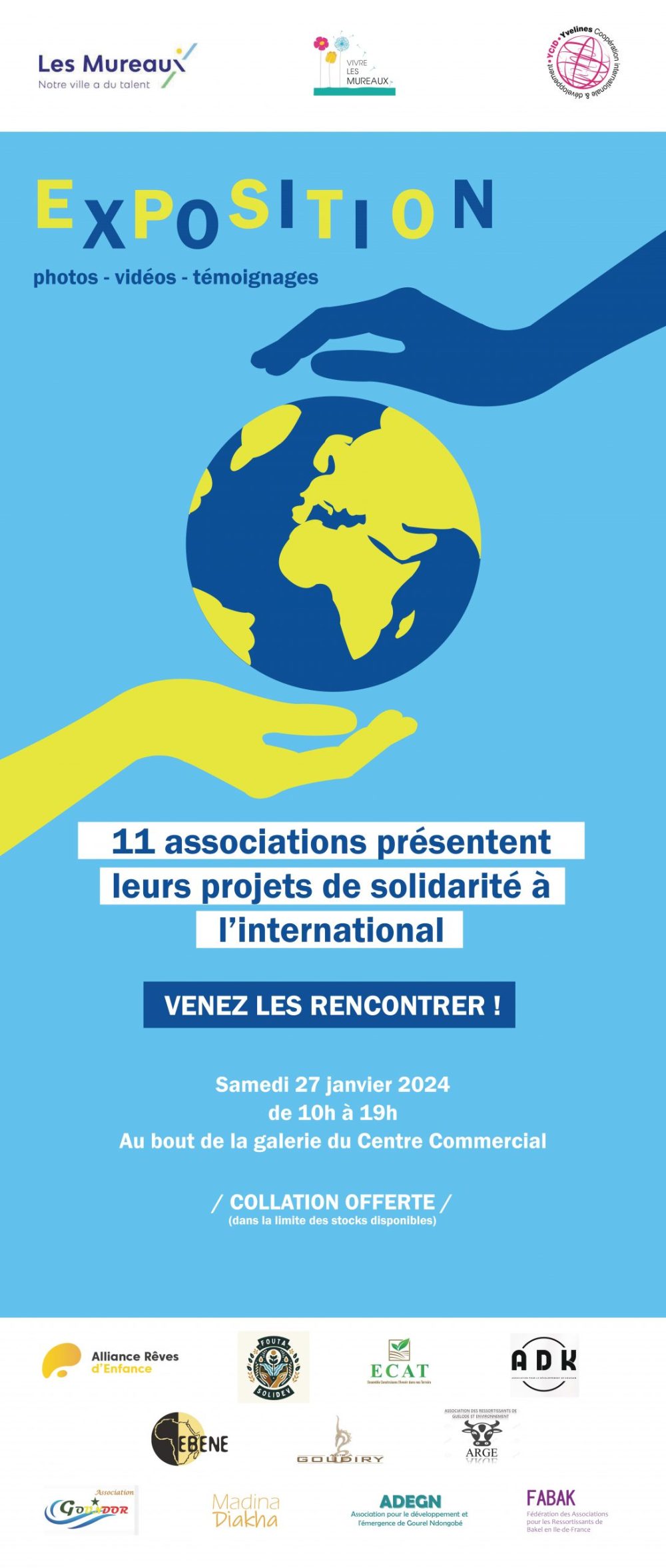 Samedi 27 janvier 2024 de 10h à 19h Au bout de la galerie du Centre Commercial VENEZ LES RENCONTRER ! 11 associations présentent leurs projets de solidarité à l’international EXPOSITION photos – vidéos – témoignages / COLLATION OFFERTE / (dans la limite des stocks disponibles)
