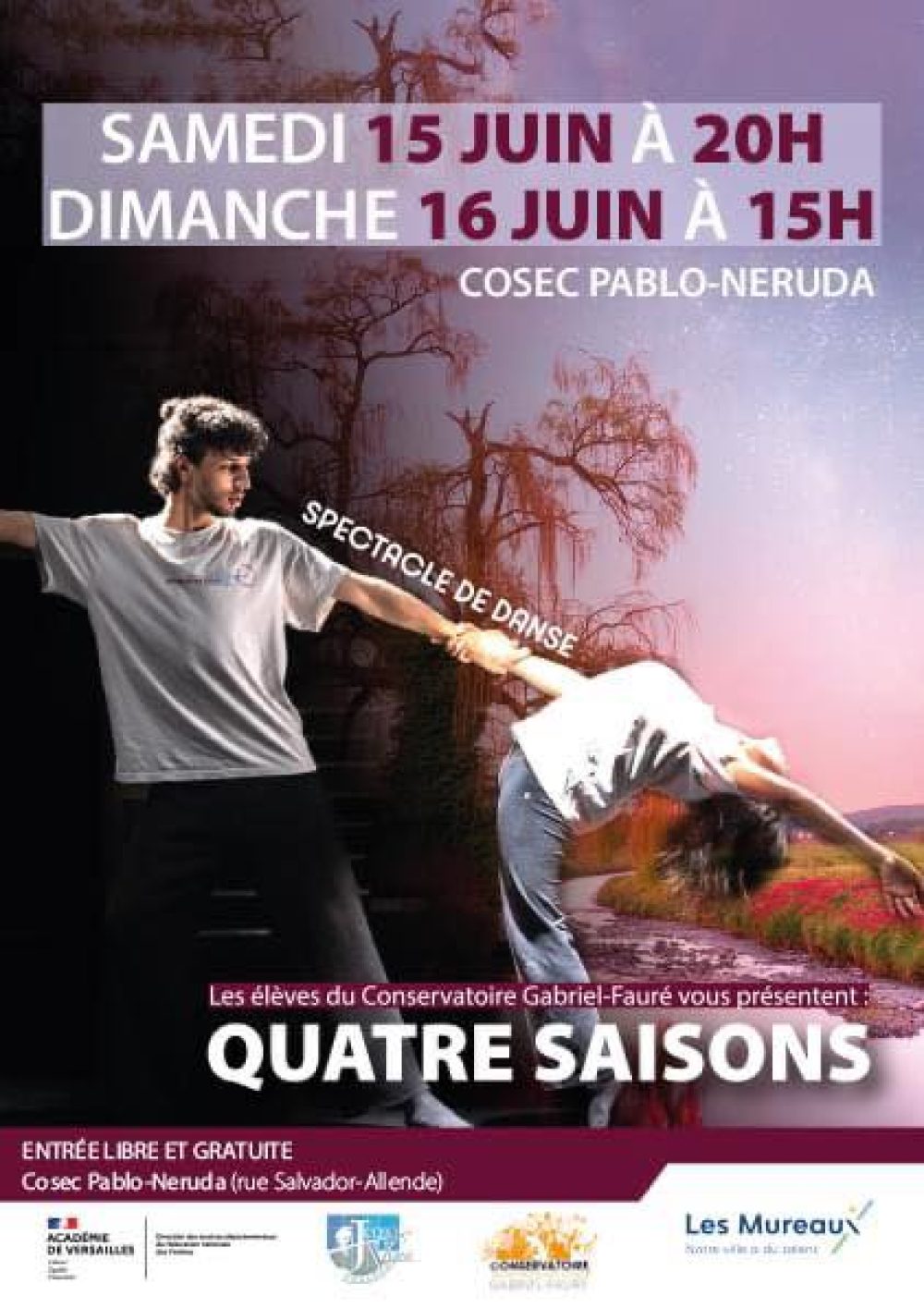 Spectacle de danse des élèves du Conservatoire Gabriel-Fauré et des élèves de la Classe à Horaires Aménagés Danse (CHAD), accompagnés de leurs professeurs. Danse classique, modern’jazz, danse contemporaine, claquettes ou encore hip-hop, tous les styles seront représentés sur scène autour du thème : Les quatre saisons.