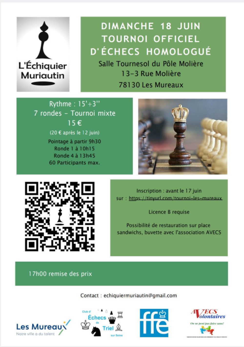 Dimanche 18 juin 2023, le jour de l’appel, est organisé un tournoi officiel d’échecs homologué au Pôle Molière des Mureaux.