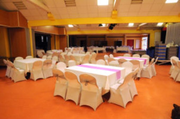 Équipement : La salle est équipée de tables rondes et rectangles, de chaises, de deux cuisines avec plaques électriques, de frigos, d’un réchauffe-plats et de sanitaires.