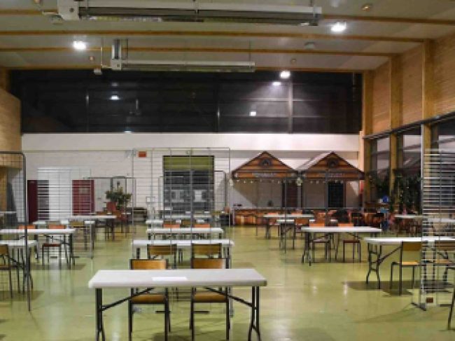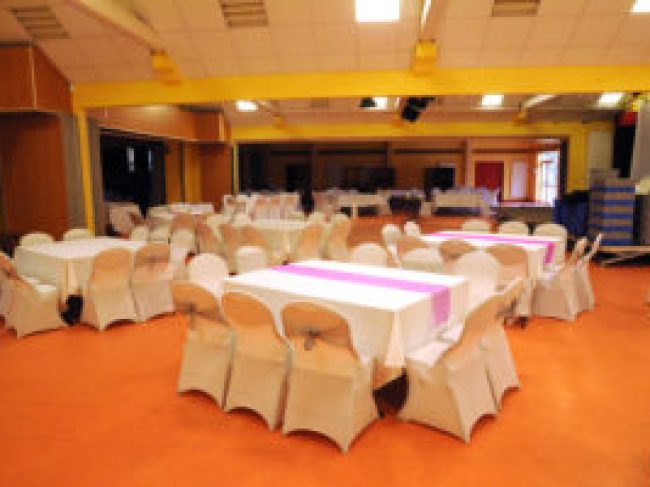 Salle modulable pouvant accueillir jusqu’à 650 personnes pour des spectacle, conférences, mariages. Possibilité de séparer la salle en 2 par une cloison insonorisée. Salle équipée de tables rondes et rectangles, de chaises, de deux cuisines avec plaques électriques, de frigos, d’un réchauffe-plats et de sanitaires.